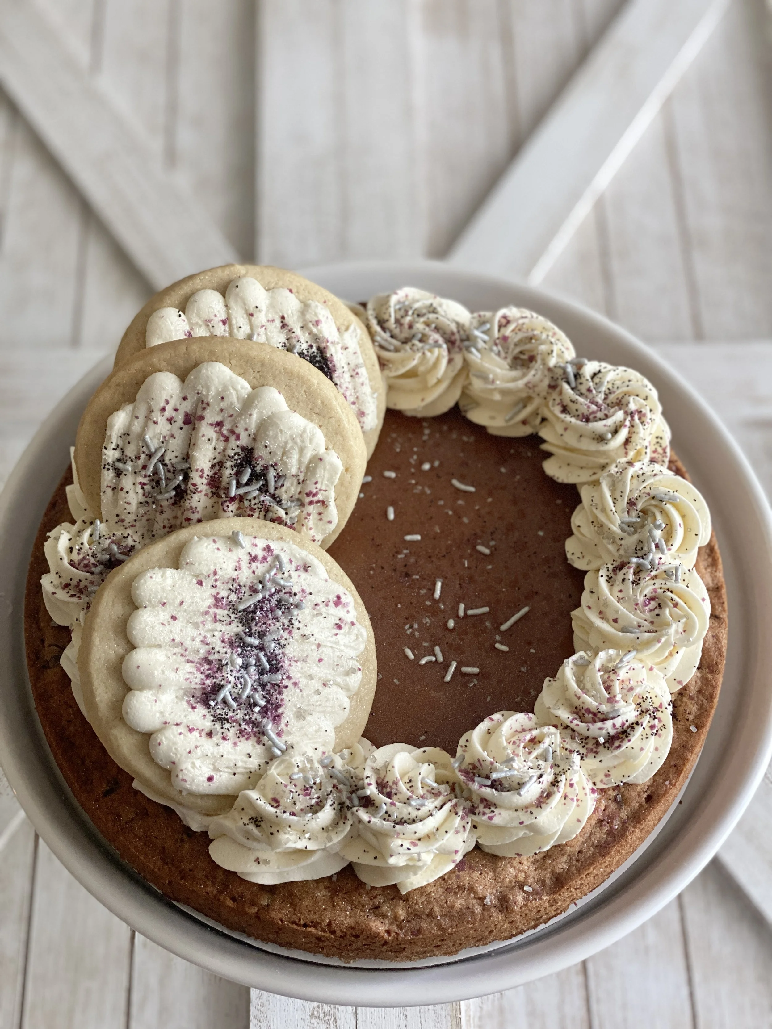 Salted Caramel Chocolate Chip Cookie Cake with Sugar Cookies